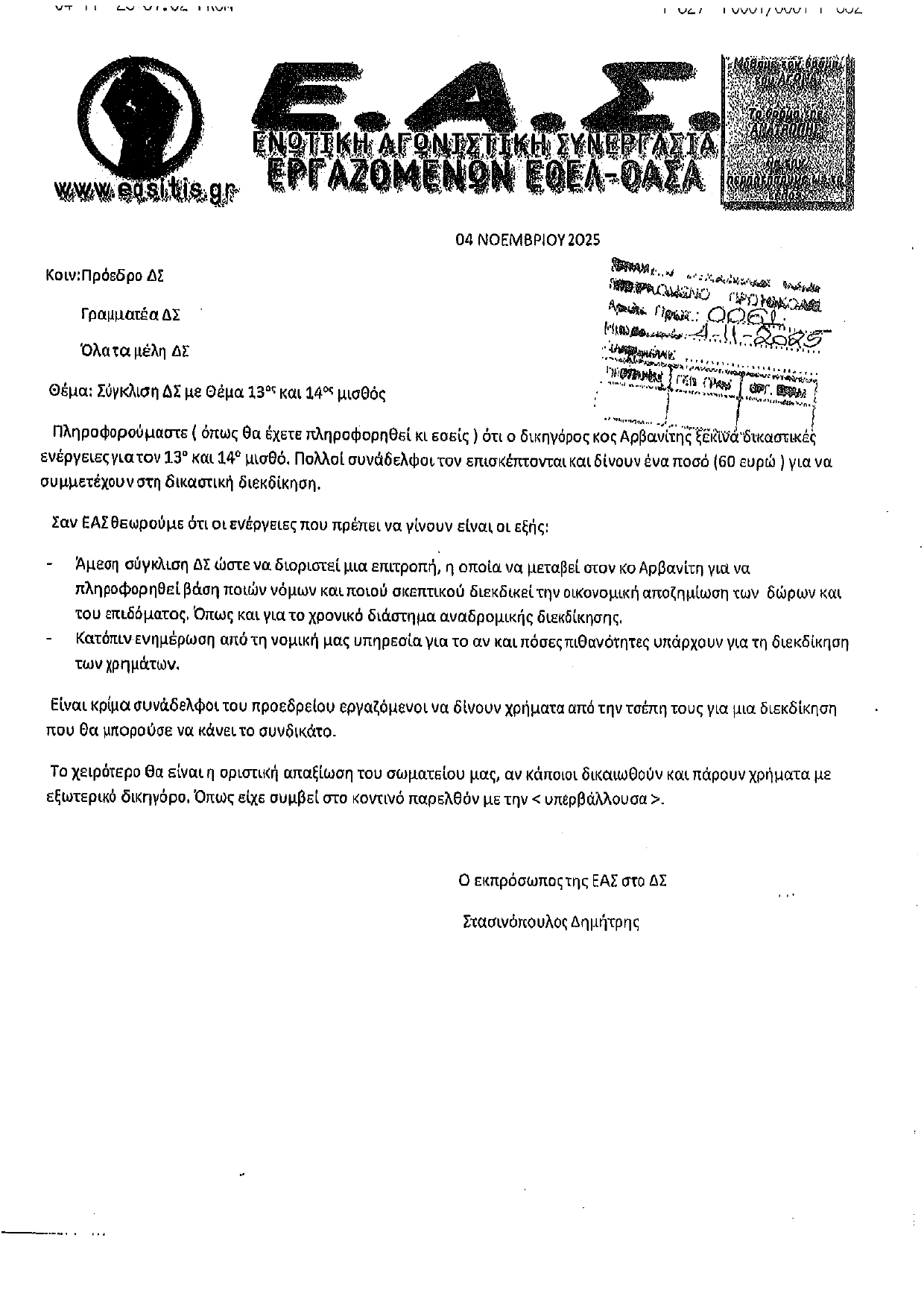 Θέμα: Σύγκλιση ΔΣ με Θέμα 13°ς και 14ος μισθός